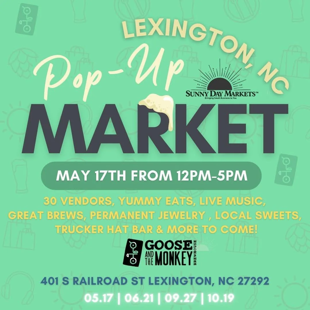 Join us on May 17th for an unforgettable day at Goose and Monkey Brewhouse in the heart of Lexington, NC, where great beer and amazing local finds come together! Sip on your favorite brews while browsing a curated selection of handmade goods, art, vintage finds, jewelry, home décor, and more from talented local vendors. Whether you're shopping for a gift, treating yourself, or just looking for a fun afternoon out, this market has something for everyone.